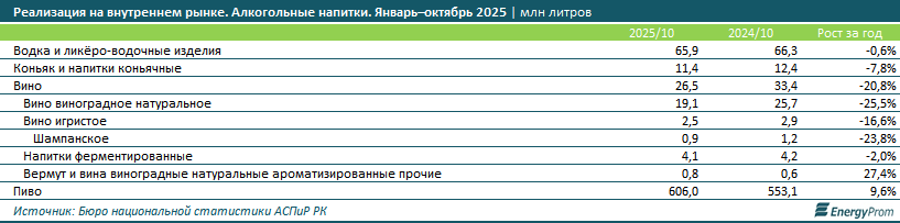 Если рассмотреть структуру внутреннего рынка алкогольных напитков, безусловное лидерство в 2025-м (впрочем, как и предыдущие несколько лет) остаётся за самой слабоалкогольной продукцией — пивом. За десять месяцев текущего года в РК реализовали 606 млн литров пенного — на 9,6% больше, чем годом ранее. На втором месте по объёмам продаж оказались крепкие напитки — водка и ликёро-водочная продукция: 65,9 млн литров. Вино заняло третье место с показателем в 26,5 млн литров.