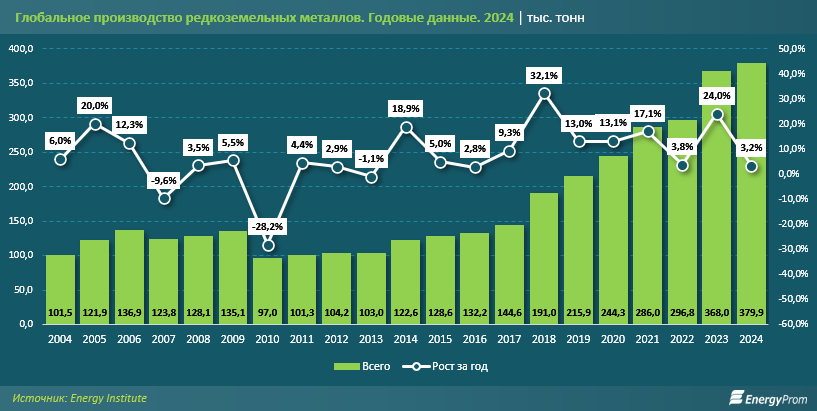 За последние два десятилетия мировой рынок редкоземельных металлов прошёл через несколько структурных волн — от резкого падения предложения в начале 2010-х до взрывного роста в 2018–2023 годах. Если в 2004-м мировое производство РЗМ составляло всего 101,5 тыс. тонн, то к 2024 году оно достигло 379,9 тыс. тонн, увеличившись в 3,7 раза.