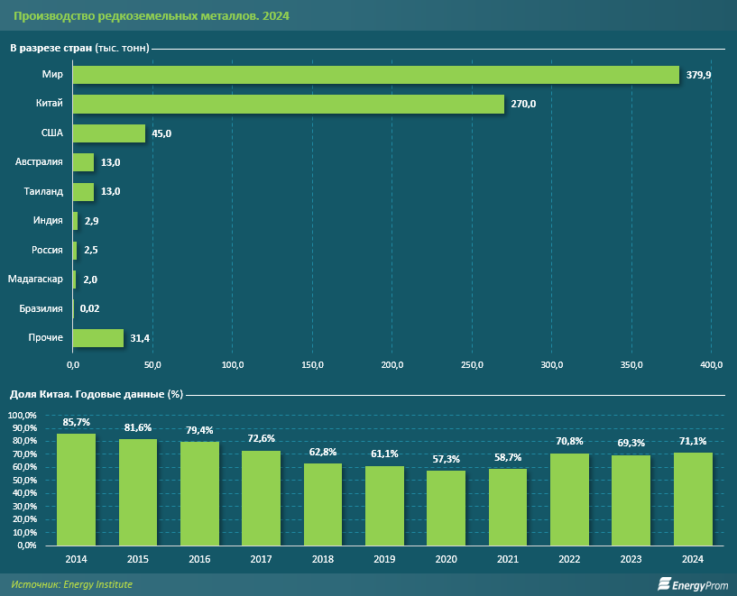 В разрезе стран производство редкоземельных металлов в 2024 году выглядело следующим образом: Китай — 270 тыс. тонн, США — 45 тыс. тонн, Австралия и Таиланд — по 13 тыс. тонн, Индия — 2,9 тыс. тонн, Россия — 2,5 тыс. тонн, Мадагаскар — 2 тыс. тонн, Бразилия — лишь 20 тонн, прочие страны, вместе взятые — 31,4 тыс. тонн.