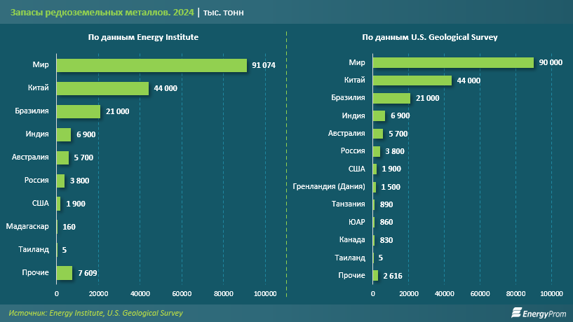 Что касается мировых запасов редкоземельных металлов, на 2024 год они составляли около 91 млн тонн по данным Energy Institute и около 90 млн тонн — по данным U.S. Geological Survey. Китай сохранил лидирующую позицию с 44 млн тонн. Следом расположились Бразилия (21 млн тонн), Индия (6,9 млн тонн), Австралия (5,7 млн тонн) и Россия (3,8 млн тонн). Запасы США, согласно информации Energy Institute, оцениваются в 1,9 млн тонн, Мадагаскара — в 160 тыс. тонн, Таиланда — в 5 тыс. тонн. Совокупные запасы прочих стран варьируются от 2,6 млн до 7,6 млн тонн в зависимости от источника данных.