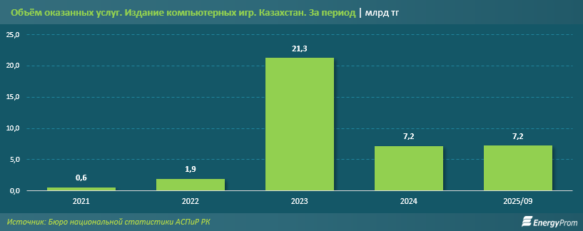 Объём оказанных услуг по изданию компьютерных игр в Казахстане за январь–сентябрь прошлого года составил 7,2 млрд тг — сразу на 77,2% больше, чем за аналогичный период 2024-го*. При этом за весь 2024 год, по уточнённым данным, объём услуг по изданию компьютерных игр также составлял 7,2 млрд тг.