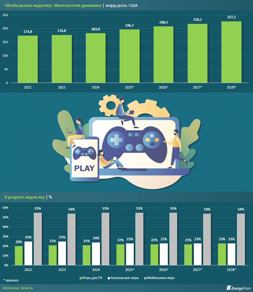 Между тем мировой рынок видеоигр оценивается в 196,7 млрд долл. США в 2025 году — на 7,5% больше, чем в 2024-м. К 2028 году он увеличится до 227,2 млрд долл. США. Более половины объёма приходится на мобильные игры: 108 млрд долл. США, рост за год — на 7,7%. Следом идут игры для консолей: 45 млрд долл. США — на 4,2% больше, чем годом ранее. Рынок игр для ПК показал самый внушительный прирост: на 10,4%, до 43 млрд долл. США.