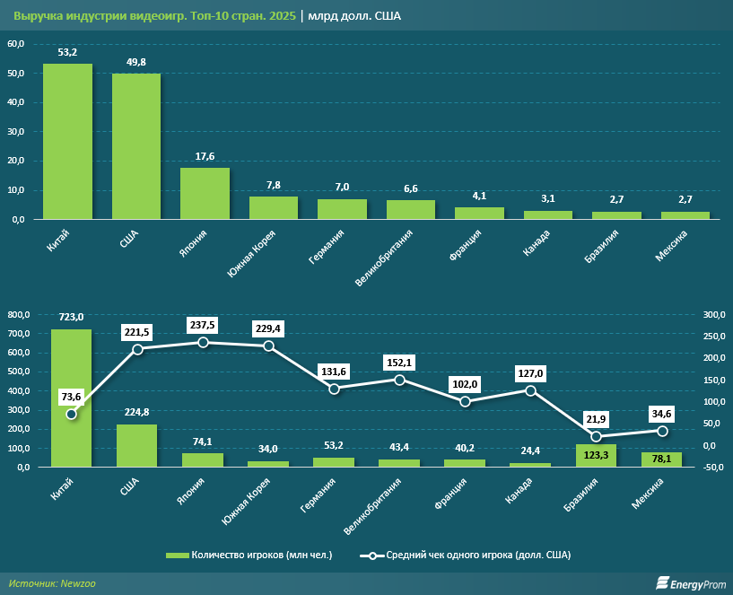 По объёмам выручки индустрии видеоигр в мире по итогам 2025 года лидируют Китай и США: 53,2 млрд и 49,8 млрд долл. США соответственно. При этом в Поднебесной насчитывается в 3,2 раза больше игроков, чем в Штатах, а средний чек одного игрока в сегменте видеоигр в Китае составляет лишь 73,6 долл. США, против 221,5 долл. США у американского геймера.