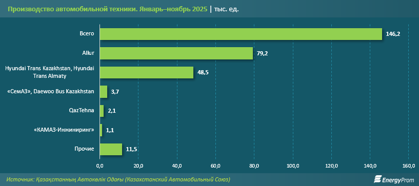 Лидирует Allur из Костанайской области: 79,2 тыс. ед. автомобильной техники за 11 месяцев текущего года, или 54,2% от всего производства в секторе по стране.