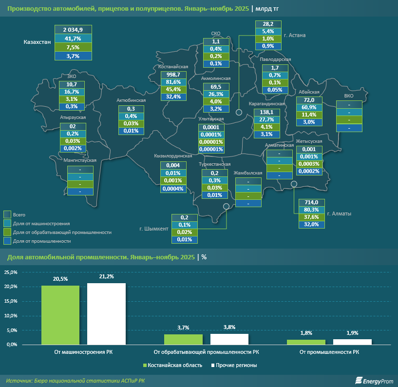 Значительный вклад в развитие автомобильной промышленности обеспечила Костанайская область, где сосредоточены основные производственные мощности (Allur). На регион пришлась почти половина общего объёма выпуска автомобилей, прицепов и полуприцепов. Автопром занимает доминирующее положение в промышленной структуре области: его доля в машиностроении региона достигла 81,6%, в обрабатывающей промышленности — 45,4%, а в промышленности в целом — около трети, что фактически делает отрасль ключевым промышленным драйвером Костанайской области.