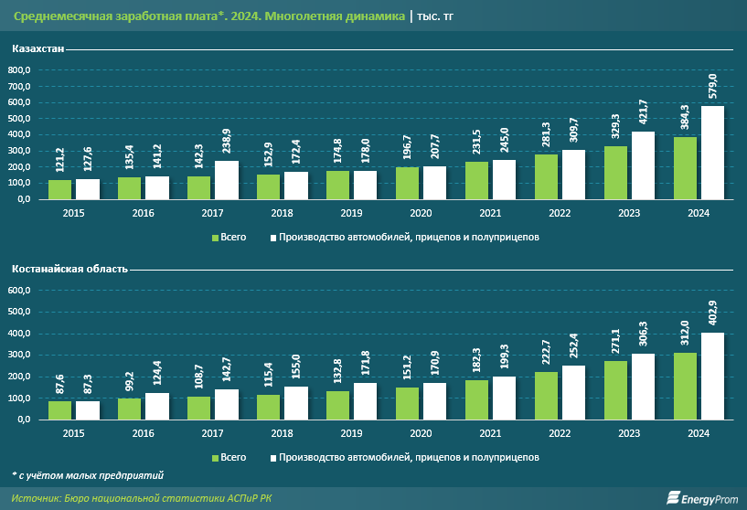 Динамика заработных плат отражает изменение экономической роли автомобильной промышленности. В 2015 году среднемесячная заработная плата* в автопроме лишь незначительно — на 5,3% — превышала среднереспубликанский уровень. Однако по итогам 2024-го разрыв существенно увеличился: среднемесячная заработная плата в отрасли оказалась выше средней по стране примерно в 1,5 раза: 579 тыс. против 384,3 тыс. тг.