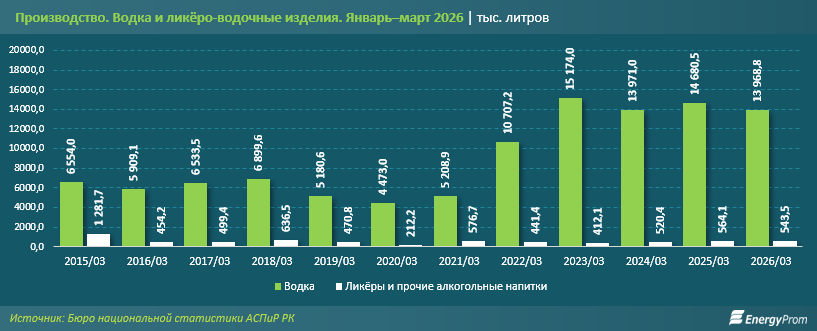 В январе–марте текущего года производство водки в Казахстане составило 14 млн литров. По сравнению с аналогичным периодом 2025-го объём выпуска сократился на 4,8%. Пик производства за последние десять лет пришёлся на 2023-й, когда было выпущено 15,2 млн литров водки — на 8,6% больше, чем в текущем году.
