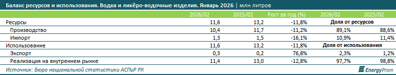Отечественные предприятия обеспечили спрос (реализацию на внутреннем рынке плюс экспорт) на водку и ликёро-водочные изделия за январь-февраль 2026-го на 89,1%, выпустив 10,4 млн литров продукции — на 11,2% меньше, чем годом ранее. Импорт при этом сократился ещё заметнее — на 16,1%, до 1,3 млн литров. Доля импортной продукции за год уменьшилась с 11,4% до 10,9%.