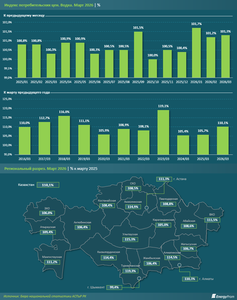 В региональном разрезе по итогам марта 2026 года наибольший рост цен на водку в годовом выражении был зафиксирован в Туркестанской (на 19,3%), Улытауской (на 15,3%) и Акмолинской (на 14,9%) областях. Значительное удорожание также было отмечено в Алматинской (на 14,5%) и Кызылординской (на 14,4%) областях. Единственным регионом, где цены незначительно снизились, стал Шымкент: минус 0,6%.