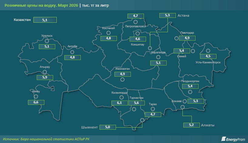 Розничная цена на водку в среднем по Казахстану в марте 2026-го составила 5,1 тыс. тг за литр, против 4,7 тыс. тг в марте прошлого года. Среди крупных городов и областных центров дороже всего водка стоила в Актау (6,6 тыс. тг), Кызылорде (6,1 тыс. тг) и Атырау (5,9 тыс. тг). Самые низкие цены были зафиксированы в Усть-Каменогорске (4,5 тыс. тг), Кокшетау (4,6 тыс. тг), Петропавловске (4,7 тыс. тг) и Таразе (4,7 тыс. тг). Мегаполисы близки к среднереспубликанскому уровню: в Астане литр водки стоил 5,3 тыс. тг, в Алматы — 5,2 тыс. тг, в Шымкенте — 5 тыс. тг.