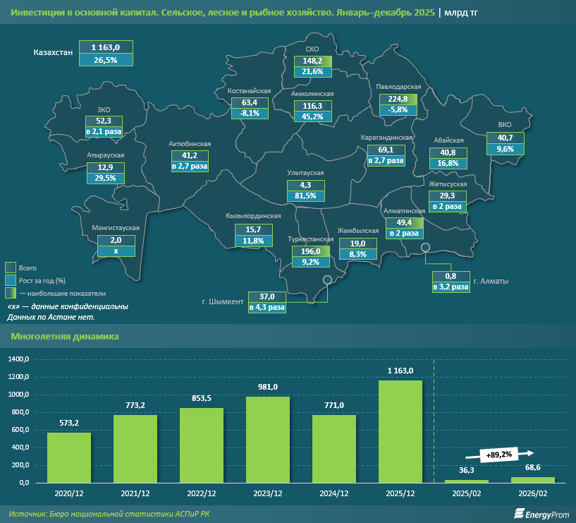 Согласно данным Бюро национальной статистики (БНС) АСПиР РК, за период с 2020 по 2025 год в Казахстане наблюдался неравномерный, но в целом положительный тренд объёмов инвестиций в сельское, лесное и рыбное хозяйство. По итогам прошлого года этот важный финансовый показатель достиг психологической отметки в 1,2 трлн тг. Рост в 1,5 раза к уровню предыдущего года был связан исключительно с низкой базой 2024-го. Заметим: инвестиции в основной капитал — величина непостоянная, зависящая от появления новых проектов, строительства ферм, покупки нового оборудования. Она априори не может быть год от года исключительно одинаковой или увеличивающейся. Поэтому та самая низкая база 2024 года, то есть меньший показатель, чем в 2023-м — всего лишь цикличное развитие сектора. При этом рост 2025 года отражает восстановление инвестиционной активности бизнеса. Данные за первые два месяца 2026-го подтверждают сохранение позитивной динамики. За январь-февраль в сектор вложили уже более 68,6 млрд тг — на 89,2% больше, чем за аналогичный период прошлого года.
