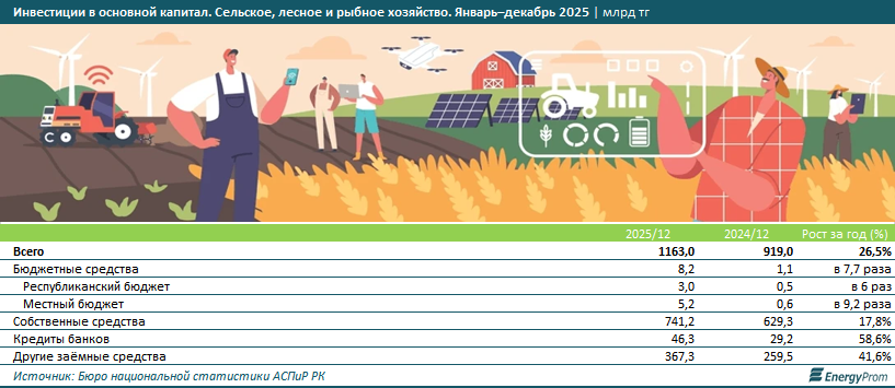 Ключевым источником инвестиций в сельском, лесном и рыбном хозяйстве остаются собственные средства предприятий: их доля в общем объёме инвестиций в 2025 году была наибольшей: 63,7% (или 741,2 млрд тг). Бизнес продолжает активно инвестировать в развитие, несмотря на внешние вызовы. Заметный рост также продемонстрировали капитальные вложения за счёт заёмных средств: объём финансирования банков увеличился на 58,6%, займы из других источников — на 41,6%. В целом структура финансирования демонстрирует диверсификацию источников инвестиций, при этом сохраняется доминирующая роль собственных средств бизнеса, дополняемая растущим вкладом государственного сектора и заёмного капитала.