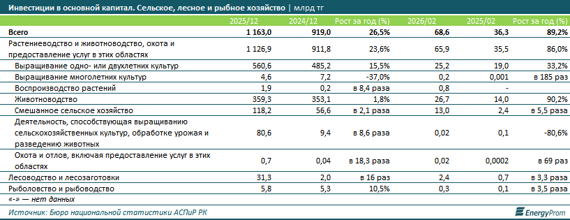 Значительные изменения наблюдались и в отдельных нишах агросектора. Так, выращивание многолетников показало сокращение объёма инвестиций на 37% (с 7,2 млрд до 4,6 млрд тг). Инвестиционная активность в тех видах деятельности, которые способствуют выращиванию сельхозкультур, в 2025-м выросла в 8,6 раза.