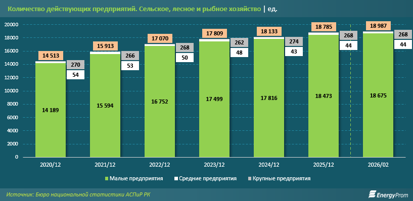 Ещё одним показателем устойчивости в секторе, о которым мы писали выше, является количество действующих предприятий. С начала 2020-го по февраль 2026 года их число увеличилось почти на треть, с 14,5 тыс. до 19 тыс. Наибольший вклад в этот рост внёс сегмент малых предприятий. В течение последних нескольких лет доля малых фермерских хозяйств была максимальной и менялась незначительно: в пределах 97%-98%. С одной стороны, это говорит о довольно простом входе в такой вид бизнеса, с другой — практически неизменное количество средних предприятий свидетельствует о трудностях с ростом малых хозяйств до средних и масштабированием бизнеса.