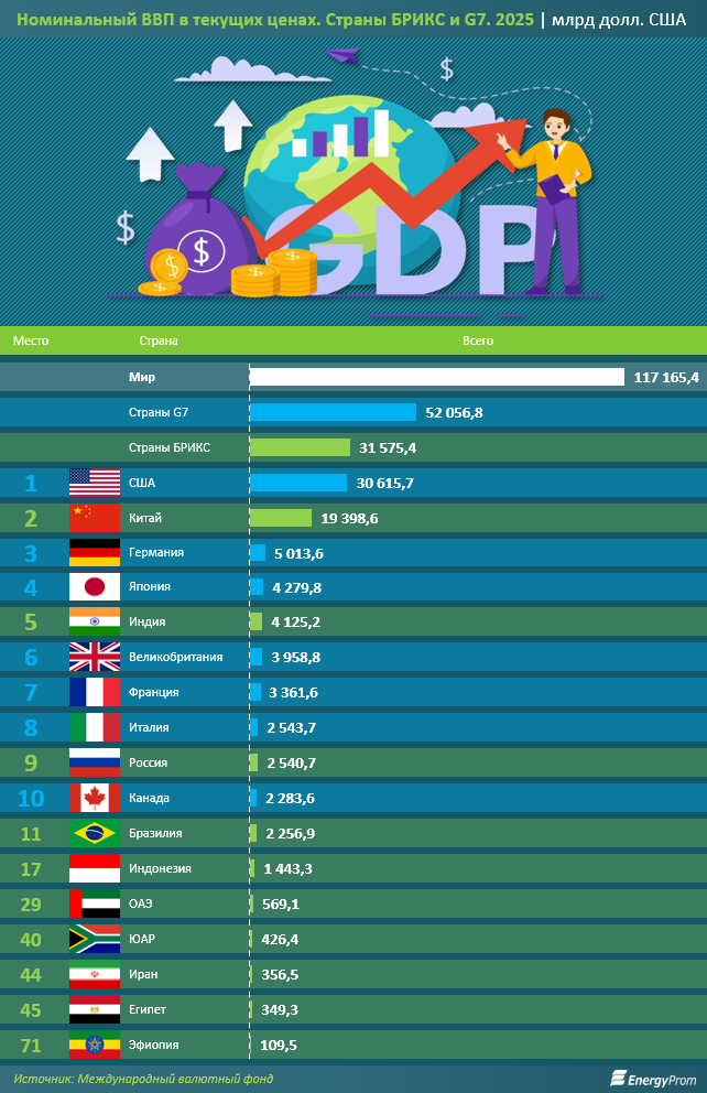 В целом в мире объём ВВП в 2025 году достигнет 117,2 трлн долл. США, из которых на страны G7 придётся 52,1 трлн долл. США, а на государства БРИКС — 31,6 трлн долл. США.