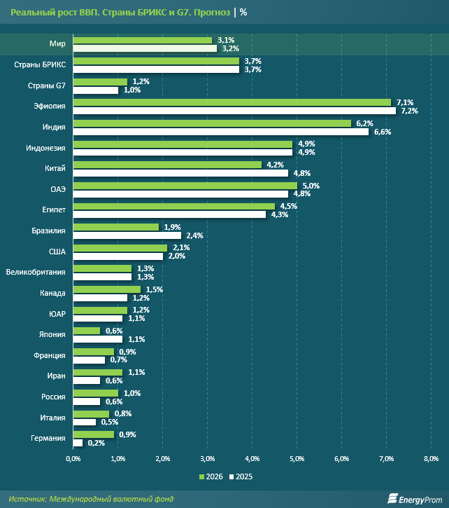 Среди государств БРИКС лидерами по темпам роста ВВП станут Эфиопия (7,2%), Индия (6,6%), Индонезия (4,9%), Китай (4,8%) и ОАЭ (4,8%). Для сравнения: крупнейшие экономики G7 будут расти значительно медленнее: США — на 2%, Великобритания — на 1,3%, Канада — на 1,2%. Таким образом, развивающиеся страны продолжат формировать основную часть глобального экономического роста, опережая средний мировой темп на уровне 3,2% в 2025 году.