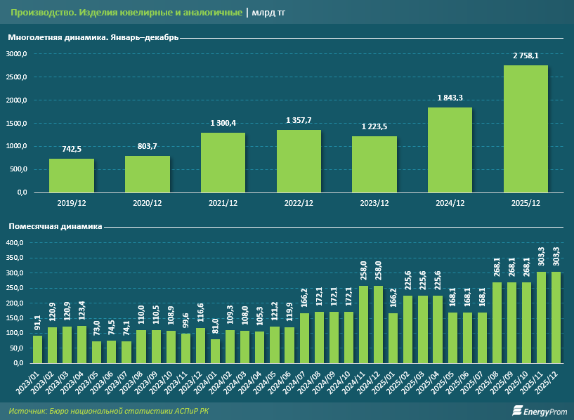 В 2025-м месячный объём производства ювелирных и аналогичных изделий варьировался от 166,2 млн тг в январе до 303,3 млн тг в декабре. Среднемесячный объём производства по итогам года составил 229,8 млн тг — значительно больше, чем в предыдущие годы. Это подтверждает сохранение ценового фактора как ключевого драйвера роста.