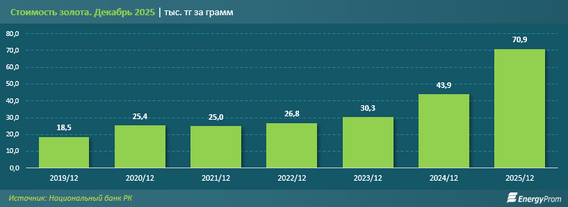 Стоимость одного грамма золота, по данным Национального банка РК, на конец 2020 года составляла 25,4 тыс. тг, а на конец 2022-го — 26,8 тыс. тг (рост — на 5,4% за два года). Уже в декабре 2023-го стоимость золота увеличилась на 13,3% за год, до 30,3 тыс. тг за грамм. По итогам 2024 года рост был значительно более выраженным: сразу на 45%, до 43,9 тыс. тг за грамм. В 2025-м рост цен на золото продолжился: по состоянию на конец года его стоимость увеличилась ещё на 61,4%, до 70,9 тыс. тг за грамм.
