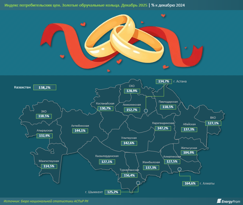 В региональном разрезе наибольшее удорожание золотых обручальных колец было отмечено в Алматы: на 64,6%. Далее следуют Туркестанская и Акмолинская области, где цены выросли на 56,4% и на 52,7% соответственно. Удорожание выше среднего по стране также наблюдалось в Карагандинской, Актюбинской и Улытауской областях.