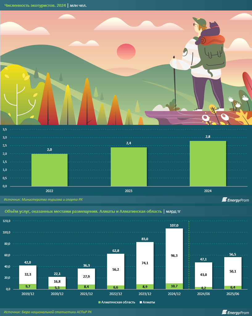 Именно территория Алматинской агломерации занимает лидирующие позиции в туристическом секторе Казахстана как по численности туристов, так и по финансовым показателям. По данным Бюро национальной статистики АСПиР РК, в январе–июне текущего года доля Южной столицы и близлежащей области в общем объёме услуг, оказанных местами размещения, составила 37,4%, или 56,5 млрд тг.