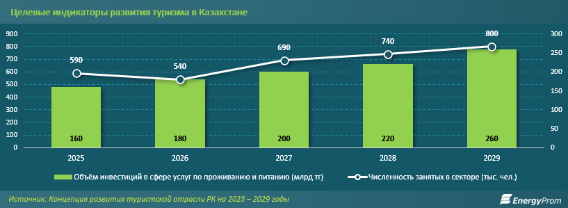 В масштабе же всей страны, согласно Концепции развития туристской отрасли РК на 2023–2029 годы, объём вложений в различные проекты сектора ежегодно будет увеличиваться, а к концу периода он должен составить 260 млрд тг. Планируется, что туризм станет одним из драйверов экономики, в этой сфере будут работать всё больше казахстанцев: к 2029 году — до 800 тыс. человек.
