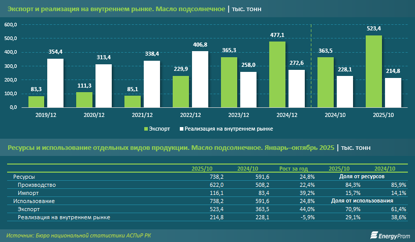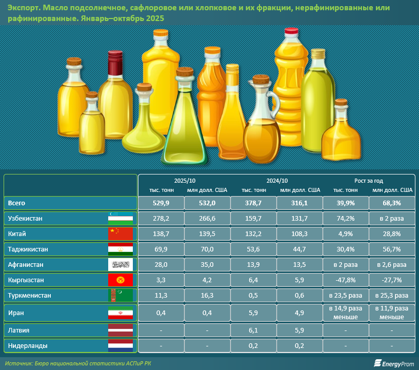 Довольно ощутимые сдвиги в продвижении этой казахстанской продукции на международных рынках начались ещё в 2022 году, когда экспорт вырос почти в 3 раза. Тогда отечественные производители начали выходить на китайский рынок. В 2023-м казахстанские поставщики продали за рубеж на 58,9% больше, в 2024-м — ещё на 30,6% больше подсолнечного масла. Динамика экспортных поставок в текущем году тоже была выразительной: плюс 44%.