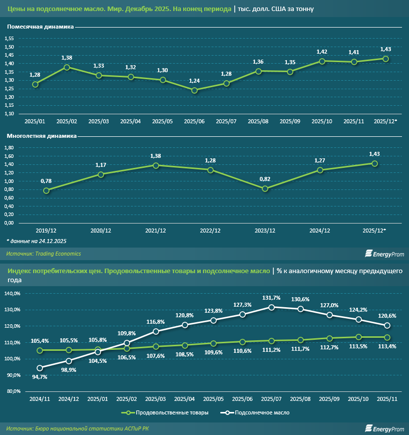 Данные международного портала Trading Economics дают обоснование заинтересованности казахстанских поставщиков в международной торговле. Согласно помесячной динамике, с июня по декабрь текущего года стоимость тонны подсолнечного масла выросла на 15,2%, достигнув максимального уровня в 1,4 тыс. долл. США. Многолетняя динамика позволяет сделать вывод, что этот максимум — рекордный уровень не только в 2025-м, но и за последние пять лет.