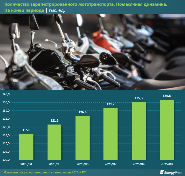 По итогам сентября текущего года в РК зарегистрировано 136,6 тыс. мотоциклов, мопедов, квадроциклов и трициклов. За месяц их количество увеличилось на 1%, а за мотосезон, с апреля — сразу на 17,9%.