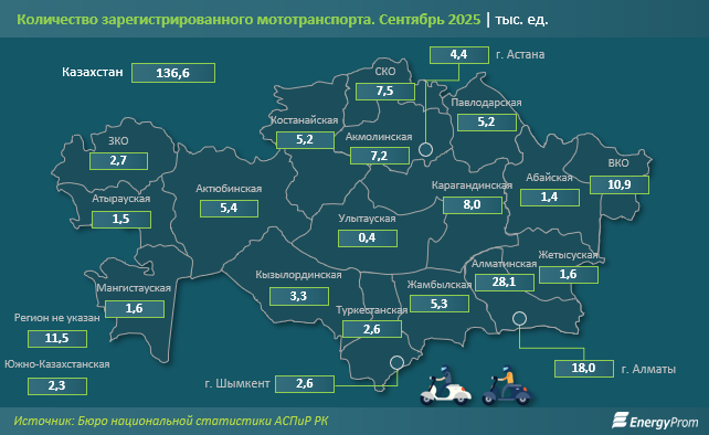 Более половины всего мототранспорта по итогам сентября текущего года было зарегистрировано в 5 из 20 регионов РК. Наибольшие показатели пришлись на Алматинскую область и Алматы: 28,1 тыс. и 18 тыс. ед. соответственно. Следом идут Восточно-Казахстанская (10,9 тыс. ед.), Карагандинская (8 тыс. ед.) и Северо-Казахстанская (7,5 тыс. ед.) области.