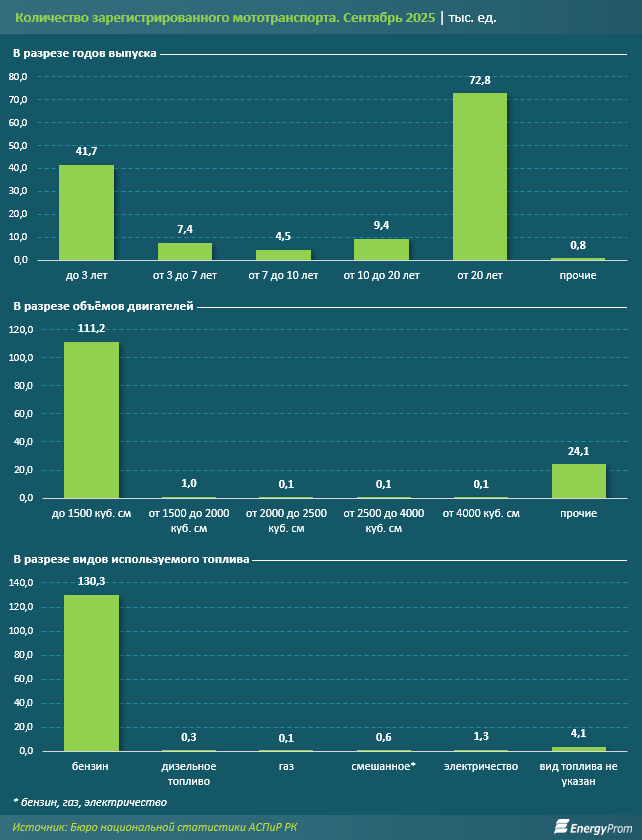 Мототранспорт не обошла участь легковых автомобилей — «стариков». Более половины мототранспорта на дорогах РК старше 20 лет: по итогам сентября их количество составило 72,8 тыс. ед. из которых сразу 20 тыс. ед. насчитывалось в одной лишь Алматинской области. Ещё 9,4 тыс. ед. пришлось на мототранспорт возрастом от 10 до 20 лет.