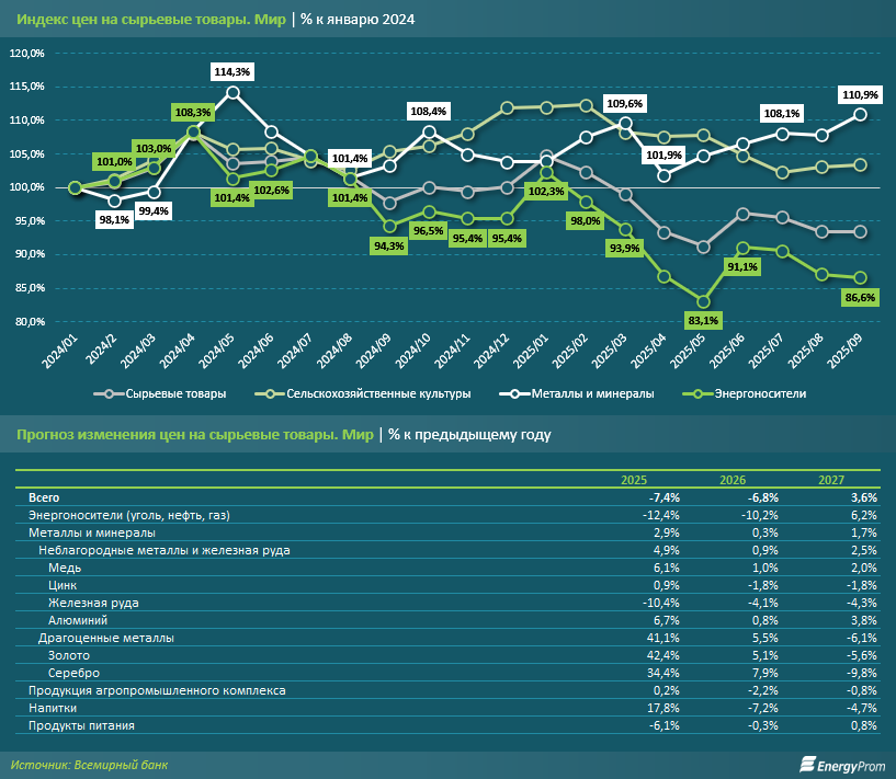 «В 2025 году глобальный избыток нефти значительно увеличился, и ожидается, что в следующем году он вырастет на 65% по сравнению с последним максимумом 2020 года. Спрос на нефть растёт медленнее, поскольку увеличиваются объёмы продаж электромобилей и гибридных авто. Прогнозируется, что цены на нефть марки Brent снизятся в среднем с 68 долл. США в 2025 году до 60 долл. США в 2026-м — это пятилетний минимум. В целом ожидается снижение стоимости энергоносителей на 12,4% в 2025 году и ещё на 10,2% в 2026 году», — говорится в релизе к отчёту Всемирного банка.