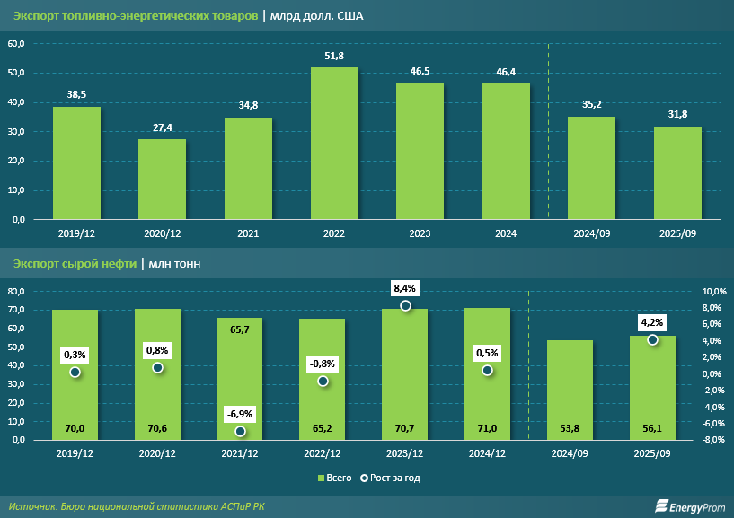 Негативная динамика продиктована исключительно волатильностью цен на мировых рынках. Ведь Казахстан, получая меньше денег, поставлял при этом продукции — непосредственно нефти — даже больше. Так, за январь–сентябрь 2025-го на экспорт ушло 56,1 млн тонн казахстанской сырой нефти — на 4,2% больше, чем за аналогичный период прошлого года. В 2024-м из РК экспортировали более 71 млн тонн нефти — почти столько же, сколько и годом ранее (70,7 млн тонн).