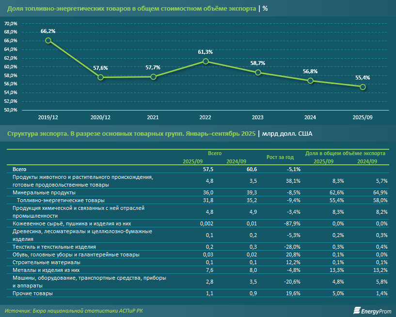 В течение последних нескольких лет Казахстан пытается диверсифицировать экономику, перестроив траекторию с сырьевого сектора на переработку. Эти усилия приносят результаты, но процесс идёт медленно: удельный вес топливно-энергетических товаров в общем объёме экспорта из РК с 2019 года уменьшился лишь на несколько процентных пунктов — с 66,2% до 55,4%, — и это всё ещё наибольшая доля.