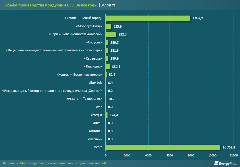 Объём произведённой на территориях СЭЗ продукции составил 10,7 трлн тг. Две трети этой суммы, или 7,9 трлн тг, пришлось на СЭЗ «Астана — новый город».