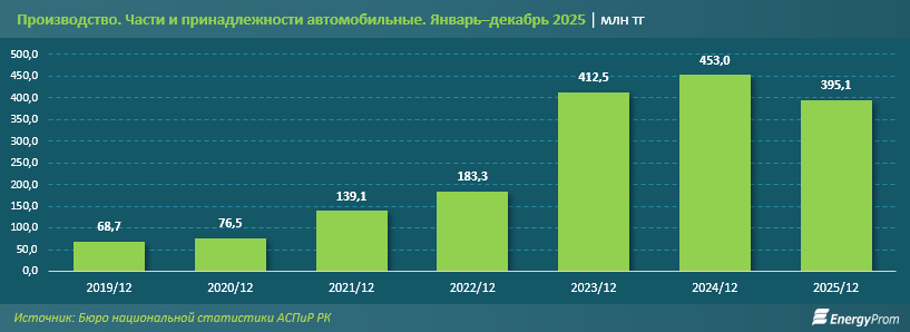 Объём производства автомобильных частей и принадлежностей в Казахстане за январь–декабрь прошлого года достиг 395,1 млн тг, увеличившись на 12,8% по сравнению с аналогичным периодом 2024-го. В среднесрочной динамике сегмент демонстрирует кратный рост: за последние пять лет объём выпуска увеличился в 5,2 раза. Если в 2019-м производство составляло лишь 68,7 млн тг, а в 2022-м — уже 183,3 млн тг, то с 2023-го отрасль стабилизировалась на уровне 400–450 млн тг в год, что указывает на переход от фазы ускоренного роста к фазе закрепления достигнутых объёмов.