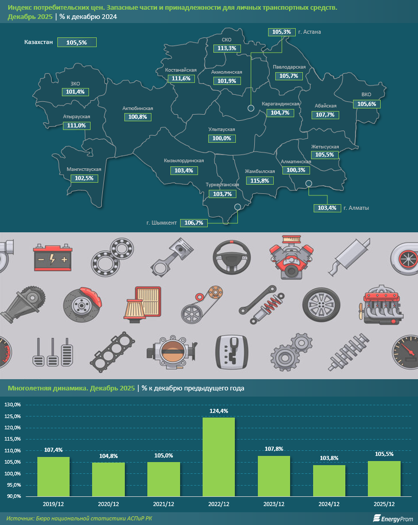 В региональном разрезе сохраняется неоднородность ценовой динамики. Наибольшее удорожание запасных частей и принадлежностей для личных автомобилей по итогам декабря 2025 года было зафиксировано в Жамбылской области: на 15,8% за год — почти в 3 раза выше среднереспубликанского уровня. Существенный рост также был отмечен в Северо-Казахстанской, Костанайской и Атырауской областях: на 13,3%, 11,6% и 11% соответственно. Минимальная динамика цен наблюдалась в Алматинской и Актюбинской областях, где удорожание составило лишь 0,1% и 0,8%. В Улытауской области цены на запчасти и принадлежности для автомобилей за год не изменились.