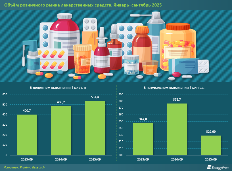 Даже при отрицательной динамике потребления в натуральном выражении в январе–сентябре 2025-го покупателям пришлось заплатить за медикаменты 537,4 млрд тг — на 11% больше, чем годом ранее. Это ещё раз подтверждает общее удорожание. За три квартала 2024-го прирост был ещё более ощутимым: на 21,3%.