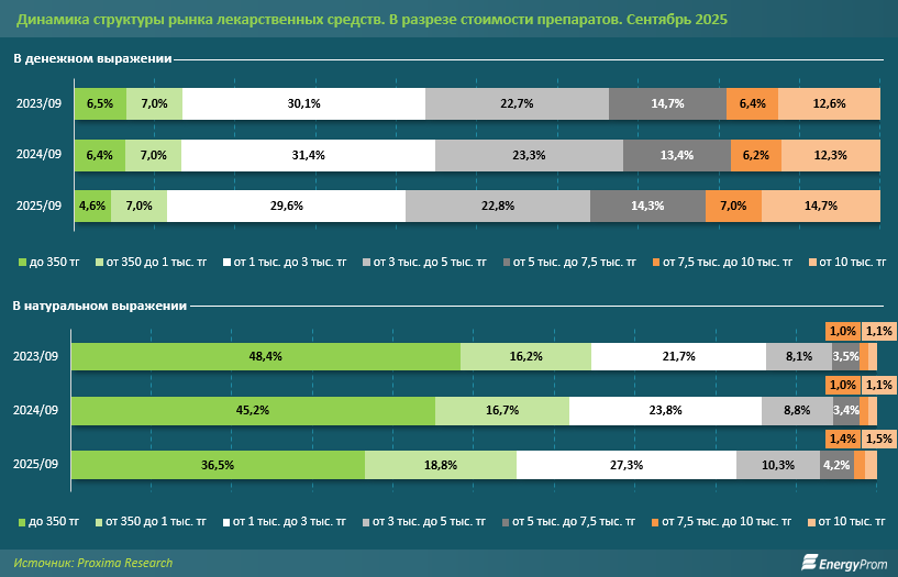 Анализ динамики структуры рынка лекарственных средств за 2023–2025 годы, по данным Proxima Research, выявил существенные изменения как в стоимостном, так и в натуральном выражении. В деньгах заметно сократилась доля дешёвых (до 350 тг) препаратов: с 6,5% в сентябре 2023-го до 4,6% в сентябре 2025 года. В натуральном выражении удельный вес самых доступных препаратов за два года уменьшился с 48,4% до 36,5%.