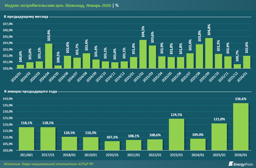 По итогам января текущего года цены на шоколад в Казахстане выросли на 2% за месяц и на 36,6% по сравнению с январём 2025-го — это один из самых высоких темпов роста за последние годы. Удорожание в 2025-м было особенно заметным в конце года: в августе и сентябре месячный прирост цен составлял 3,8%–4,8%, хотя в декабре темп замедлился до 0,7%.
