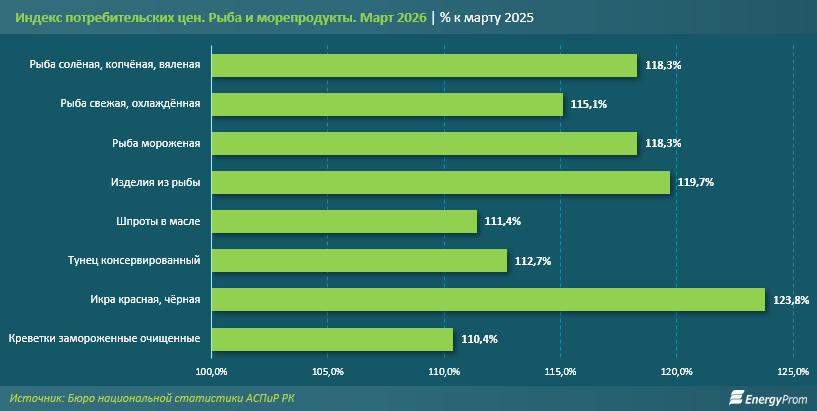 В феврале 2026 года стоимость переработанной и консервированной рыбы в казахстанских городах распределилась неравномерно. Средняя цена копчёной скумбрии по стране составила 5,8 тыс. тг за кг. Наибольшая стоимость была зафиксирована в Усть-Каменогорске (7,9 тыс. тг), Конаеве (7 тыс. тг) и Актау (6,6 тыс. тг). Наиболее доступной копчёная скумбрия была в Уральске (3,9 тыс. тг за кг) и Кызылорде (4,5 тыс. тг).