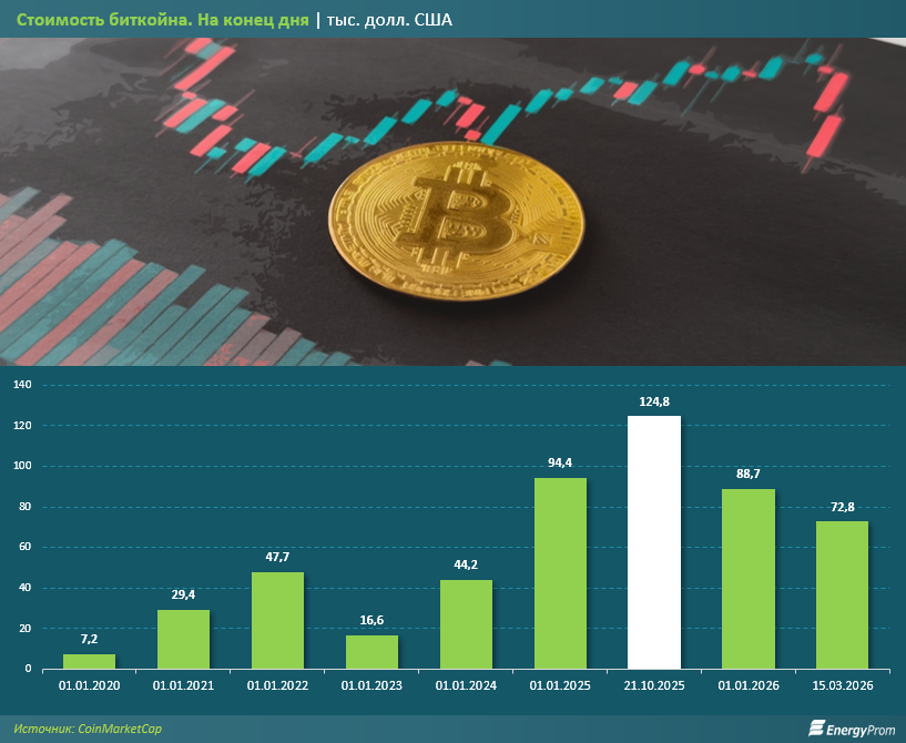 Ключевым фактором, определяющим доходность майнинга, выступает стоимость биткойна (BTC). За последние годы цена этой криптовалюты проходила через резкие циклы роста и снижения, с 7,2 тыс. долл. США на начало 2020 года до 47,7 тыс. долл. США на начало 2022-го, затем последовало падение до 16,6 тыс. долл. США в 2023 году. В дальнейшем рынок восстановился до 94,4 тыс. долл. США на начало 2025-го, с пиковым значением в 124,8 тыс. долл. США в октябре того же года. Однако уже к марту 2026-го стоимость биткойна снизилась до 72,8 тыс. долл. США, что указывает на сохраняющуюся нестабильность рынка.