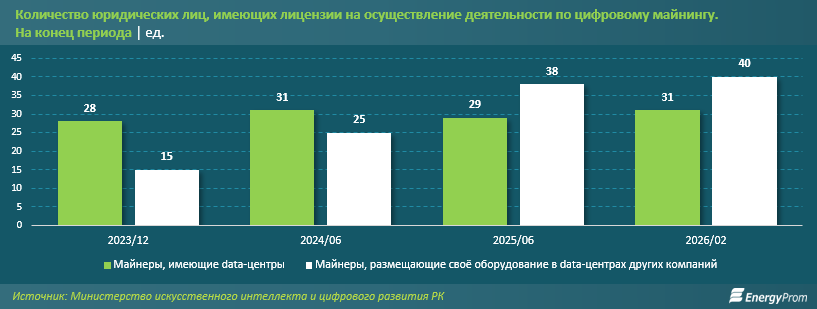 На фоне глобальных трендов институциональная структура сектора в Казахстане демонстрирует рост количества легальных участников. На декабрь 2023 года в стране насчитывалось 43 лицензиата (среди которых 28 имели собственные дата-центры, а 15 размещали оборудование в чужих). К июню 2024-го их число выросло до 56, а к июню 2025-го — до 67. По состоянию на февраль текущего года общее количество таких юрлиц достигло 71, из них 31 имеют собственные дата-центры, а 40 размещают своё оборудование в дата-центрах других компаний.