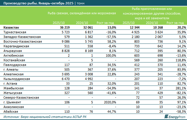 Больше всего свежей, охлаждённой или мороженой рыбы выпустили в Восточно-Казахстанской области: 9,1 тыс. тонн. Далее расположились Атырауская, Кызылординская, Туркестанская и Алматинская области.