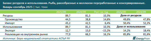 За январь–сентябрь 2025 года местные компании обеспечили спрос (реализацию на внутреннем рынке плюс экспорт) на переработанные и консервированные рыбу, ракообразных и моллюсков на 49,6%, против 47,8% годом ранее. Всего за этот период производство выросло на 14,6%, до 44,5 тыс. тонн, в то же время импорт увеличился на 6,4%, до 45,2 тыс. тонн.
