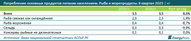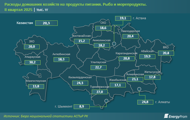 Расходы домашних хозяйств на рыбу и морепродукты во втором квартале текущего года составили 20,3 тыс. тг — на 8,4% больше, чем в аналогичном периоде 2024-го.