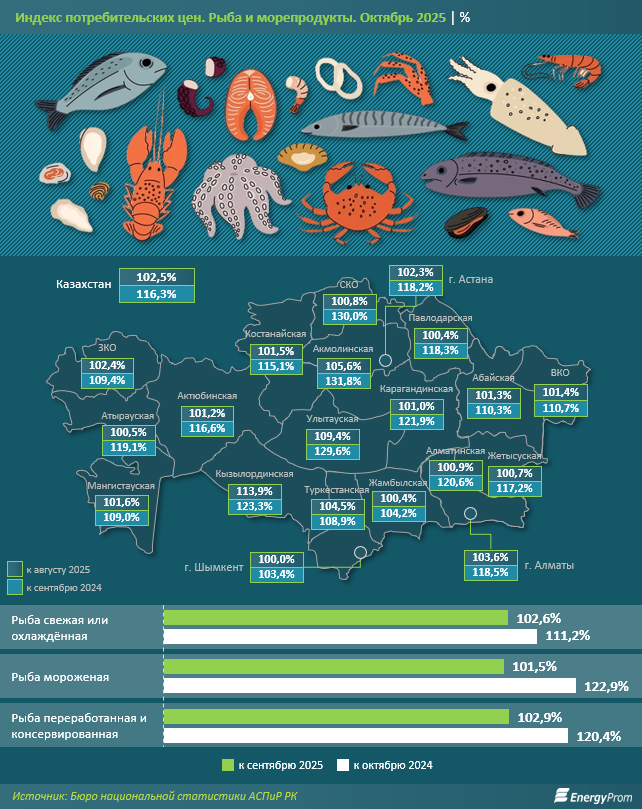 Самый заметный рост цен в месячной динамике рыба и морепродукты показали в Кызылординской области: на 13,9%. Наименьшее удорожание было отмечено в Павлодарской и Жамбылской областях: на 0,4% в каждом из регионов. Не изменились за месяц цены только в Шымкенте.