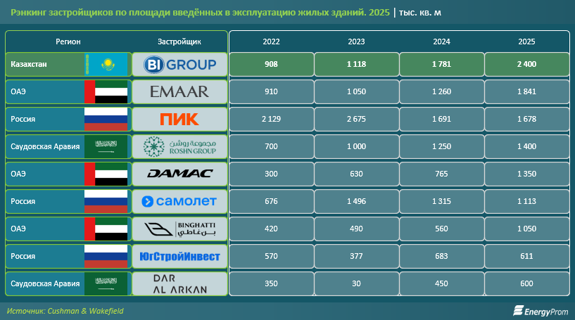 Таким образом, казахстанский застройщик вышел на уровень, сопоставимый и даже превосходящий крупнейших мировых девелоперов по площади введённых в эксплуатацию жилых зданий, несмотря на то, что они работают на более крупных и зрелых рынках. Результат BI Group выглядит особенно значимым с учётом масштабов казахстанского рынка, который заметно уступает рынкам стран присутствия глобальных девелоперов.