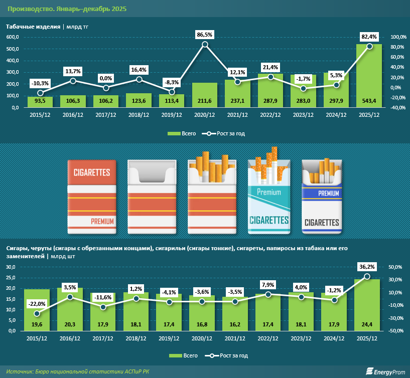 Производство табачных изделий в Казахстане в прошлом году продемонстрировало резкое увеличение в стоимостном выражении на фоне существенно более умеренной динамики физических объёмов. Это указывает на ключевую роль ценового фактора и структурных изменений в отрасли, а не на пропорциональное расширение выпуска.