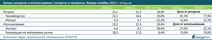 Экспорт сигарет и папирос за январь–ноябрь 2025 года вырос на 58,9%, достигнув 6,8 млрд штук. Реализация на внутреннем рынке при этом прибавила лишь 8,4%, до 18,5 млрд штук.