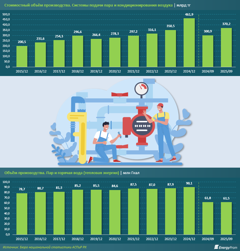 Для справки: за три квартала 2025 года подача тепловой энергии составила 61,5 млн Гкал, против 61,8 млн Гкал за аналогичный период 2024-го. В стоимостном выражении объём производства в сфере теплоэнергетики (подачи пара и кондиционированного воздуха) составил 370,2 млрд тг.